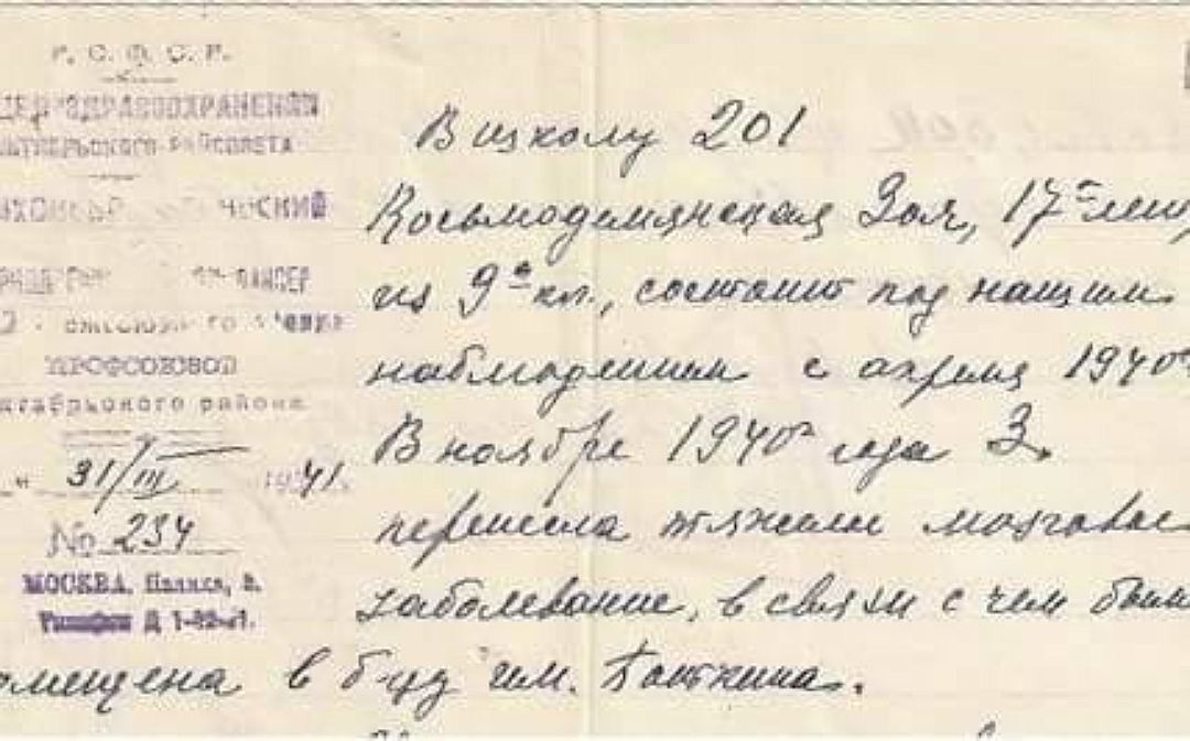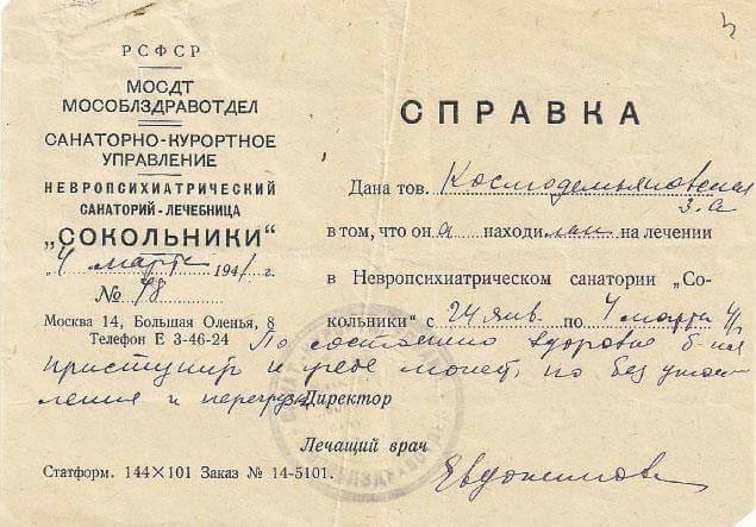 Но вот беда - на самом деле в конце 1940 года Космодемьянская находилась на лечении в больнице им. Боткина (не имевшей психиатрической специализации). А находилась она там с диагнозом "острый инфекционный менингокковый менингит". После выписки из Боткинской больницы Зоя с 24 января по 4 марта 1941 года проходила реабилитацию в санатории "Сокольники".