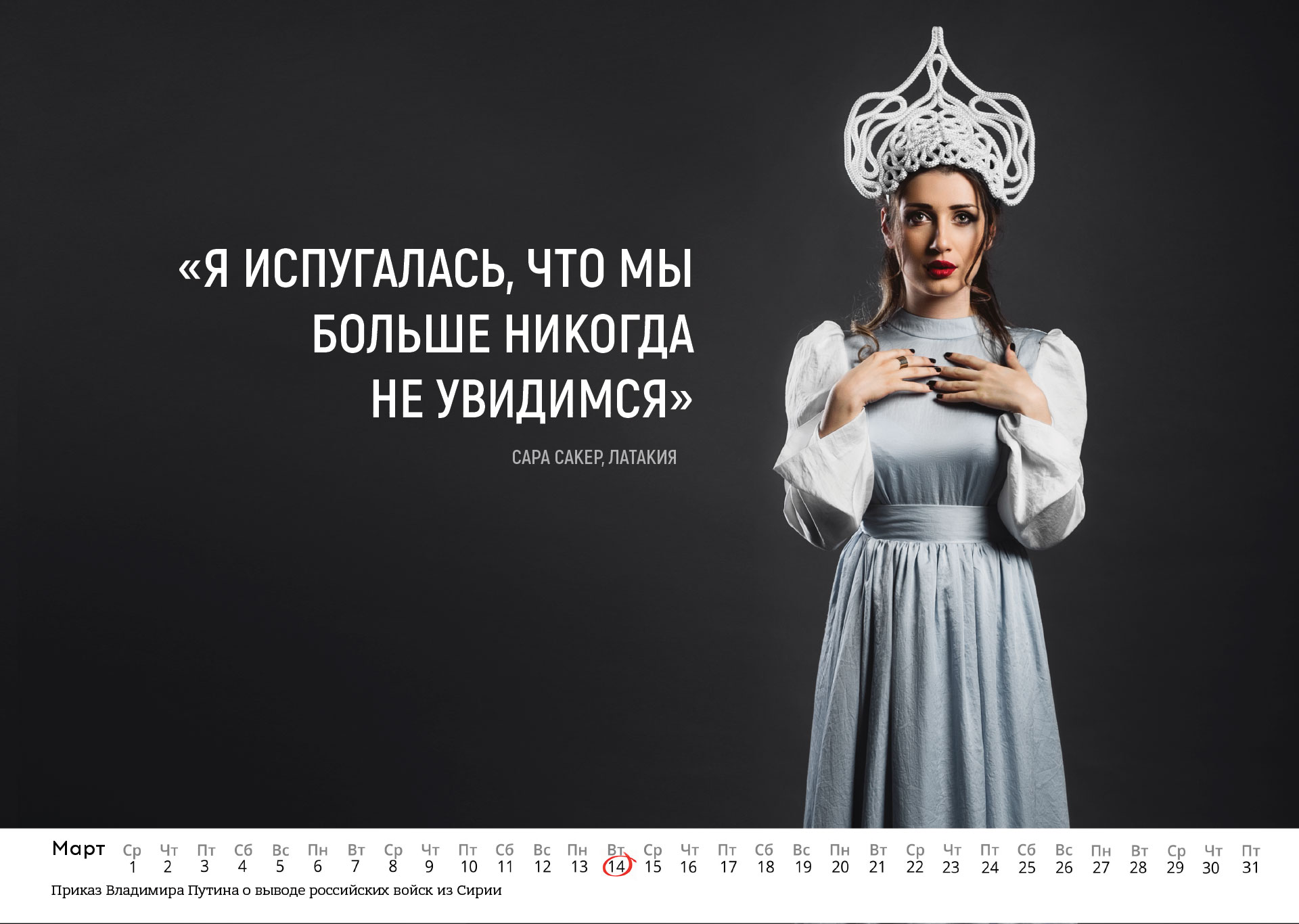 «В каждом месяце сирийская девушка говорит от первого лица российскому солдату о том, что у неё на сердце. Вместо традиционных и привычных нам праздничных дней в календаре отмечены события, связанные с важнейшими позитивными изменениями последних месяцев на сирийской территории», — говорится в пресс-релизе организаторов проекта, находящемся в распоряжении RT.