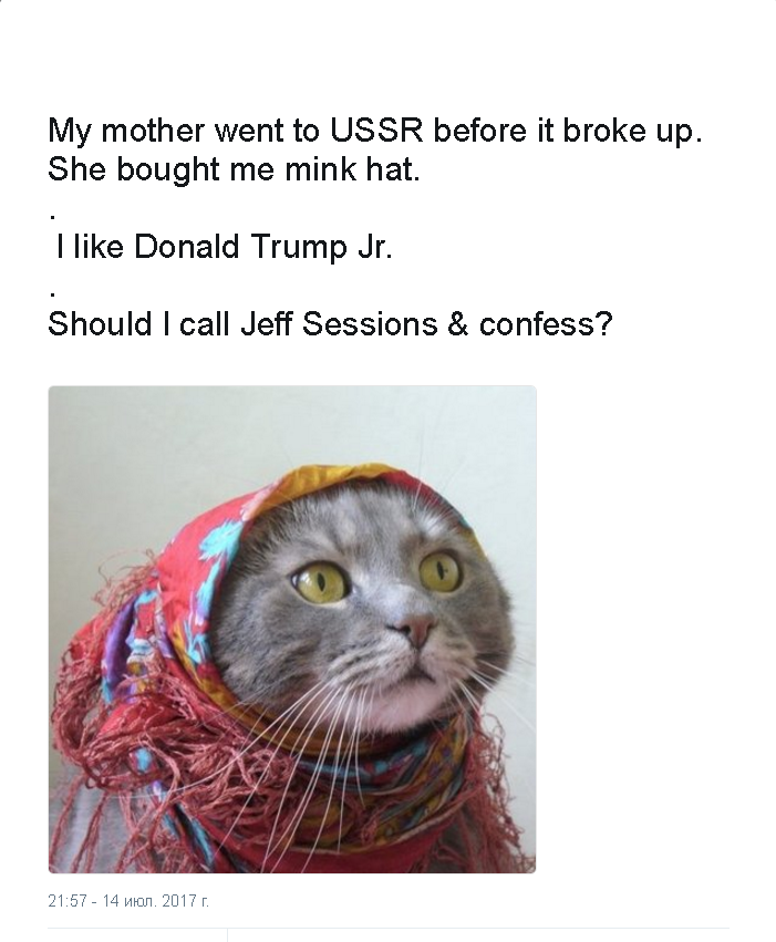 "Моя мать уехала в СССР, прежде чем мы расстались. Она купила мне норковую шапку. Мне нравится Дональд Трамп-младший. Должен ли я звонить Джеффу Сешенсу и исповедываться?"- пишет американский громадянин.