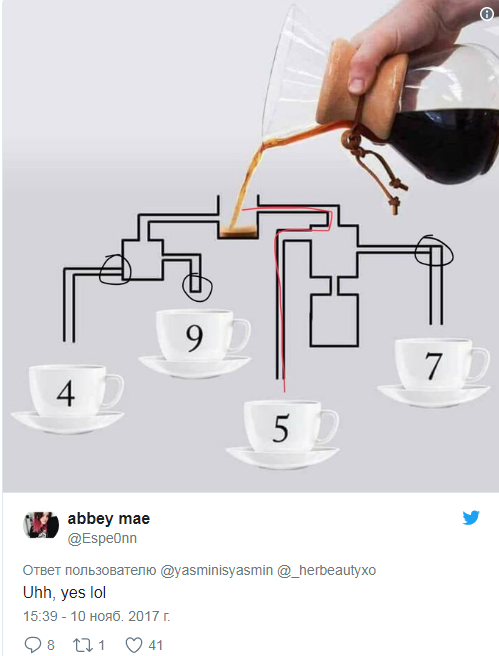 В Twitter набирает популярность головоломка, опубликованная юзером с ником Purp. Задача, посвященная кофе и сообщающимся сосудам, оказалась не по зубам многим пользователям социальной сети.