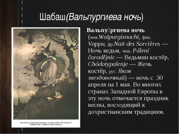 В Западной Европе ночь с 30 апреля на 1 мая носила название «Вальпургиева ночь». Считалось, что этой ночью ведьмы устраивают шабаш. Этот же день отмечался и как начало весенне-полевых работ.