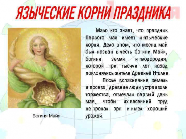 А связана она с чествованием богини Майи ещё в Древнем Риме. Эта богиня покровительствовала плодородию, земле. И в её честь устраивали красивый праздник, целью которого было умилостивить богиню перед работами на земле. Жители древней империи просили, чтобы их тяжелый труд принёс заслуженную награду, а земля дала хороший урожай. Именно в честь этой богини в дальнейшем последний месяц весны и получил свое название — май.