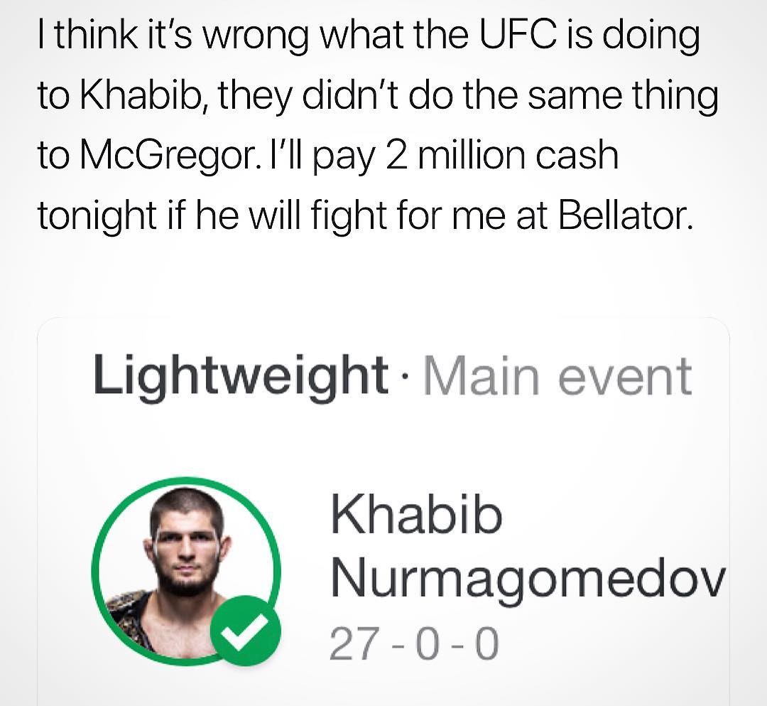 Он выразил мнение, что «UFC ведут себя неправильно по отношению к Нурмагомедову, к Макгрегору они относятся иначе», и заявил о готовности выплатить 2 млн долларов наличными «сегодня же», если россиянин согласиться уйти в Bellator.