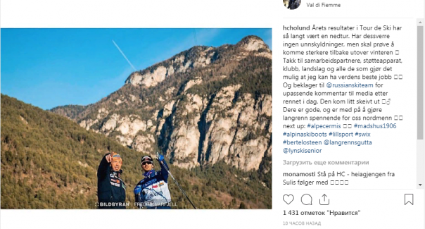 — Хочу извиниться перед российскими лыжниками за неуместный комментарий в СМИ после гонки. Он получился немного "неуклюжим". Ребята, вы хороши и делаете гонки интересными для нас, норвежцев, — написал Холунд в своем аккаунте Instagram.