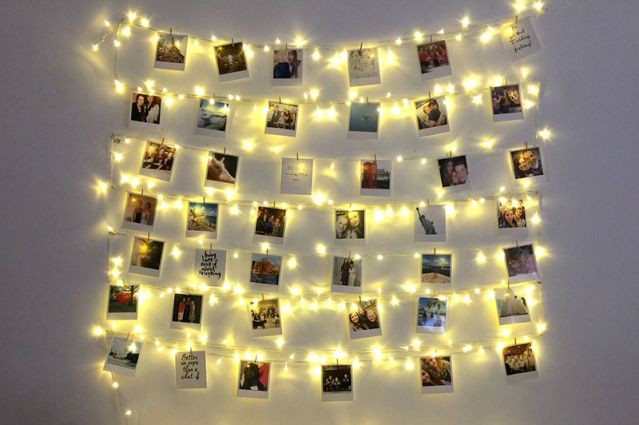 Еще одним неплохим вариантом применения снимков является создание гирлянды из фото. Для этого забейте в стену пару гвоздей (или вкрутите саморезы) и повесьте между ними веревку. Развесьте ваши фотографии, фиксируя их при помощи прищепок, а затем добавьте к ним рождественскую гирлянду, которая осветит фотографии, превратив вашу композицию в настоящий предмет декора интерьера.