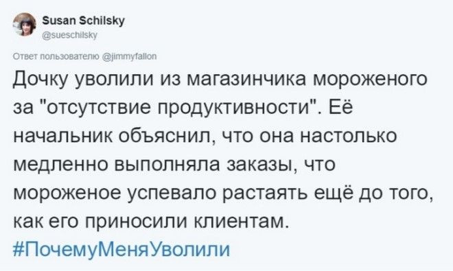 Популярный американский телеведущий Джимми Фэллон в своем твиттере регулярно организует различные опросы с обменом историями из жизни от подписчиков. Вот один из таких опросов с предложением поделиться забавными и необычными историями на работе, которые привели к увольнению.