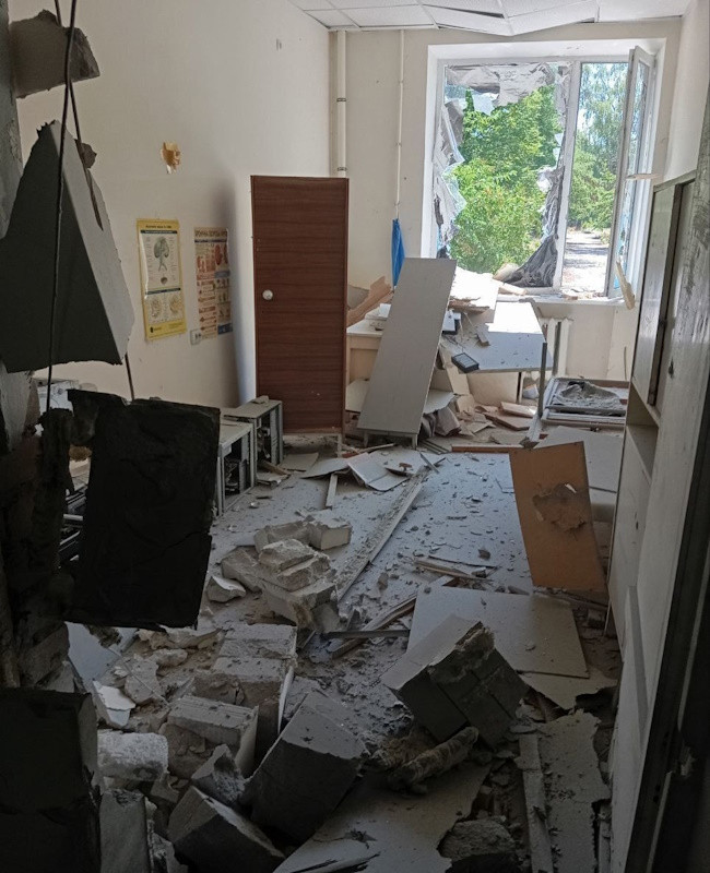 Несколько дней назад, 4 июля, около 14:00, в Алешках ударом дрона-камикадзе вновь повреждено здание центральной районной больницы! Атака пришлась по приёмному отделению больницы! Там выбиты окна, зафиксированы разрушения (фото прилагается).