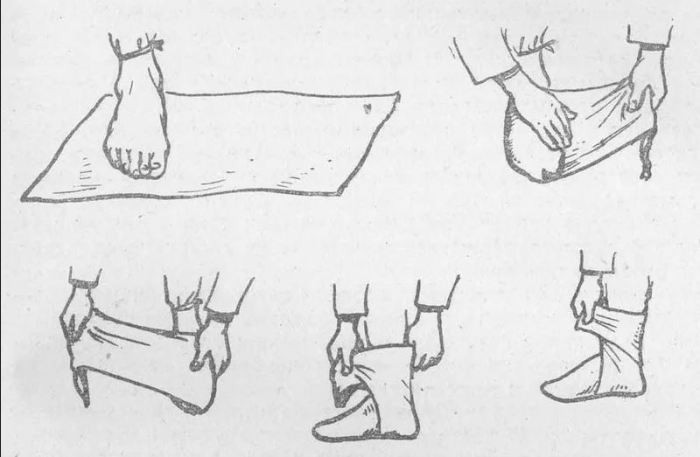 Есть способ одевать портянку быстрее носка. Его придумали солдаты, которые сначала клали портянку поверх голенища сапога, а потом просто засовывали в сапог ногу вместе с ней. Конечно, такой способ является не самым лучшим и спустя некоторое время придется замотать портянки по всем правилам, однако если нужно обуться быстро и не остаться без ног – сойдет.