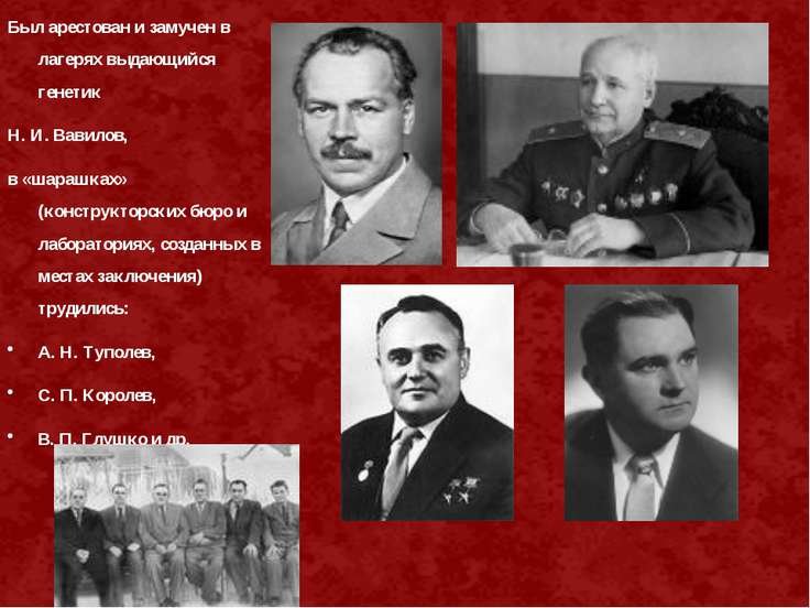 __Одним из первых в такую программу попал бывший первый зам наркома оборонной промышленности, авиаконструктор Андрей Николаевич Туполев, осужденный за «вредительство». На второй день новой работы Туполеву поручили сформировать штат конструкторского бюро – т.е., взять ручку, бумагу и составить список известных ему арестованных авиаспециалистов. Подумав, он решил написать всех, кого знает – а знал он всех. И арестованных, и не арестованных. Вдруг, пока шло его дело еще кого-то посадили.