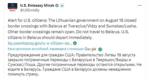Посольство США в Минске призывает своих граждан, находящихся в Белоруссии, немедленно покинуть страну. Сообщение опубликовано в Twitter посольства.