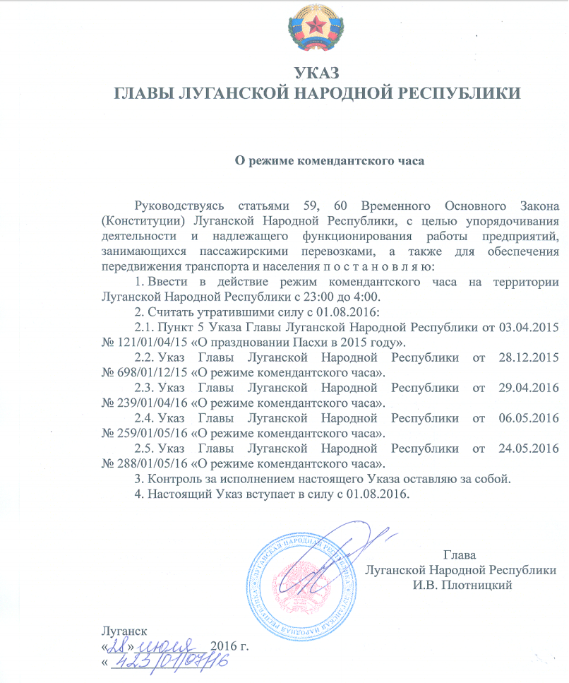 Глава ЛНР Игорь Плотницкий своим указом сократил действие комендантского часа с 1 августа 2016 года.