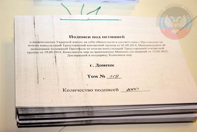«За время действия Минских соглашений Украина не выполнила ни одного пункта Комплекса мер. Более того, с украинской стороны наблюдается постоянный саботаж переговорного процесса. Продолжаются обстрелы, граждане Донецкой Народной Республики продолжают гибнуть от огня украинской артиллерии. Терпение исчерпано. И мы передаем коллективное обращение от оргкомитета, который работает над сбором подписей под петицией о невыполнении Украиной Минских соглашений, полномочному представителю ДНР в трехсторонней Контактной группе Денису Пушилину. Мы пытаемся достучаться до мировой общественности и показать им реальную картину происходящего в Донбассе», — отметила представитель оргкомитета Ольга Позднякова.