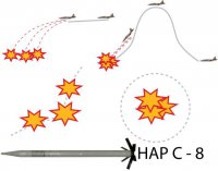 Украинский же летчик пуск произвел не с пикирования, а, скорее всего, с прямого полета, опустив в момент пуска нос самолета на 3-5 градусов. Поэтому разрывы и легли в характерную кривую линию. Судя по количеству воронок, было два залпа с «отсечкой» по восемь ракет в каждом. Интервал между пусками 2-3 секунды.