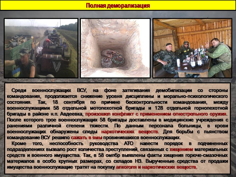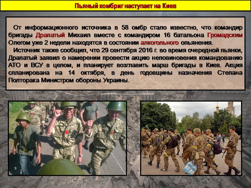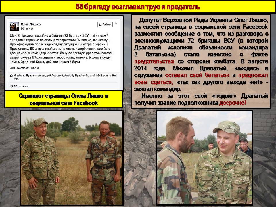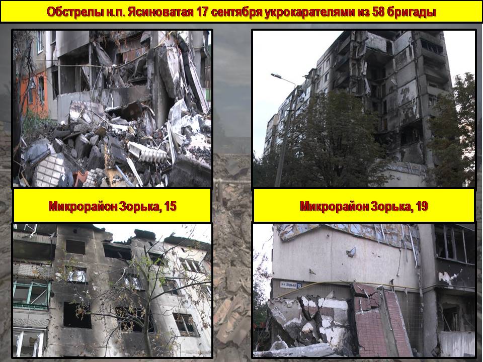 «Командир 58 отдельной мотопехотной бригады Дропатый в пьяном угаре использовал весь арсенал запрещенного вооружения и в течение дня планомерно выпустил по Ясиноватой четырнадцать 122-мм артиллерийских снарядов, произвел 12 выстрелов из танка и выпустил 41 мину калибром 120 и 82 мм», — сказал замкомандующего.