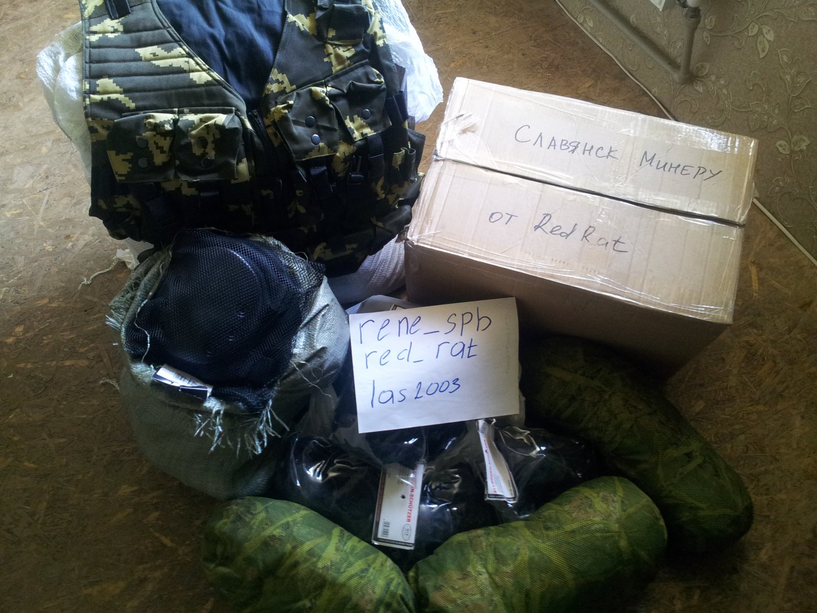 Разведывательно-диверсионная группа в Славянске получила: 3 бинокля ночного видения, 4 монокуляра ночного видения, один мощный бинокль для наблюдателя, 6 радиостанций Kenwood с гарнитурами, 10 пачек осветительных ракет с пускателями, 15 пар берцев, 20 разгрузок, 20 маскхалатов "берёзка", 20 пар тактических перчаток, 3 маскхалата "леший" для снайперов, коллиматорные прицелы с кронштейнами и тактическими рукоятками, накидки, противомоскитные средства.