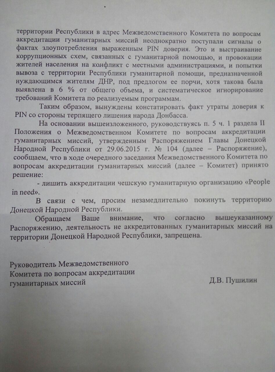 «Двадцать пятого ноября 2016 решением комитета по вопросам аккредитации гуманитарных организаций ДНР прекращена деятельность чешской международной общественной организации «Человек в беде», — отметили в пресс-службе. — Основанием запрета деятельности этой организации и отзывом ранее выданной лицензии послужило систематическое игнорирование требований комитета к реализуемым программам по выдаче гуманитарной помощи жителям ДНР и несоответствии деятельности организации «Человек в беде» ранее заявленным целям».