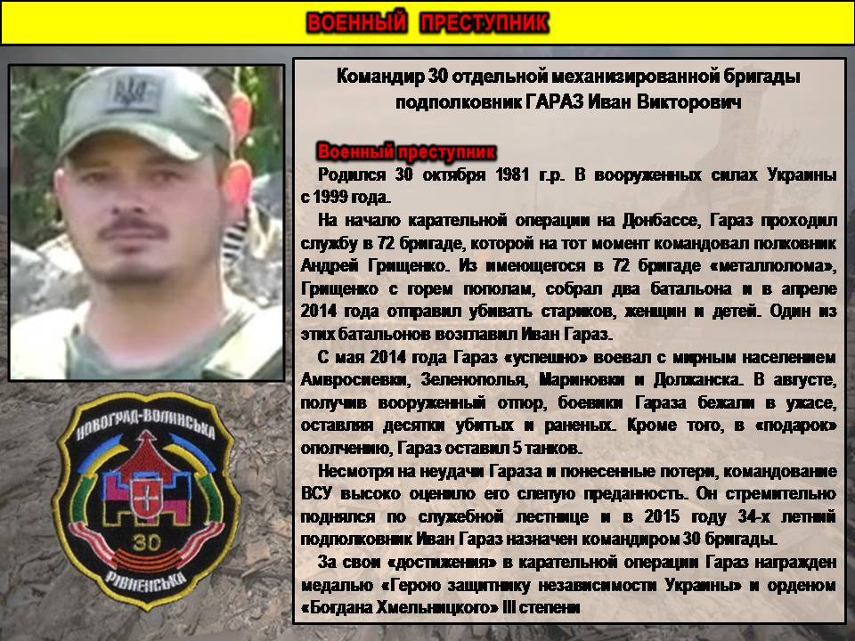Досье включает также информацию о руководителе украинской группы в Совместном центра по контролю и координации вопросов прекращения огня генерал-майоре Борисе Кременецком. В командовании ДНР отметили, что украинская сторона в СЦКК не прилагает должных усилий для выполнения мирных договоренностей, а действия Кременецкого можно расценивать как пособничество военным преступлениям Гараза.