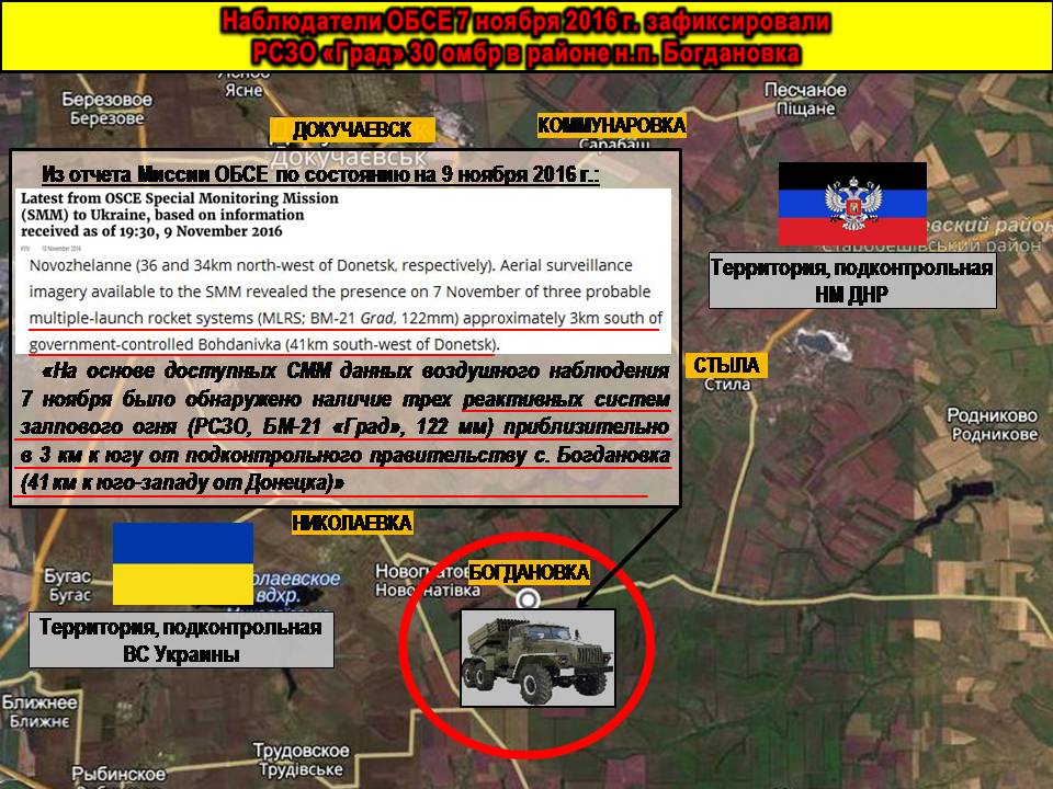 Напомним, что разведка ДНР регулярно фиксирует переброску Киевом военной техники в зону конфликта. Между тем, согласно Комплексу мер по выполнению Минских соглашений, подписанный Контактной группой 12 февраля 2015 года, арторудия калибрами свыше 100 мм должны быть отведены друг от друга на 50 км, РСЗО — на 70 км, РСЗО «Торнадо», «Ураган», «Смерч» и ракеты «Точка» на 140 км. В соответствии с сентябрьским дополнением стороны должны были отвести артиллерию калибром до 100 мм, танки и минометы. Несмотря на это территория ДНР регулярно подвергается обстрелам с использованием указанных видов вооружения.