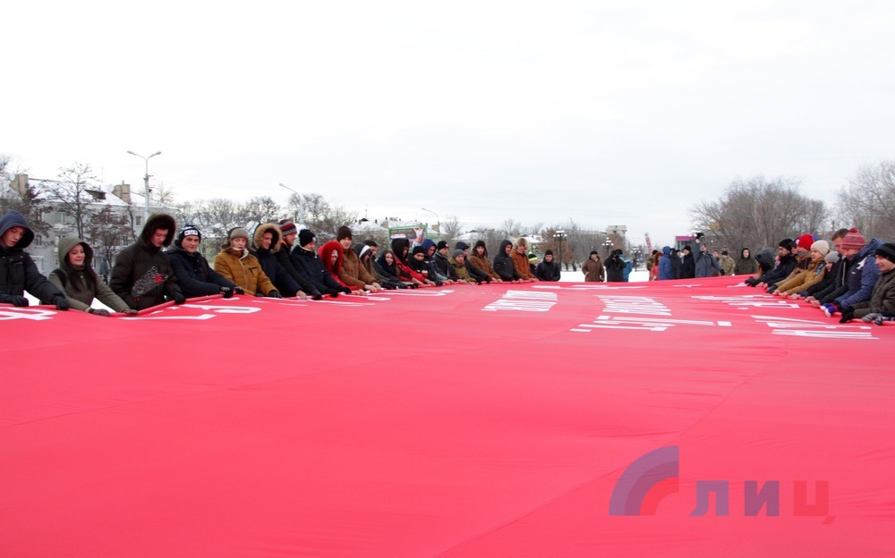 В Луганской народной республике не намерены отступать от позиций неприятия надругательства над памятью предков и своей истинной великой историей, как это ныне практикуется на Украине. Молодые активисты ЛНР вместе с общественными деятелями России развернули у памятника воинам-освободителям в Луганске копию Знамени Победы площадью 200 кв. м. в рамках акции "Марш Победы - Молодая гвардия шагает по миру".