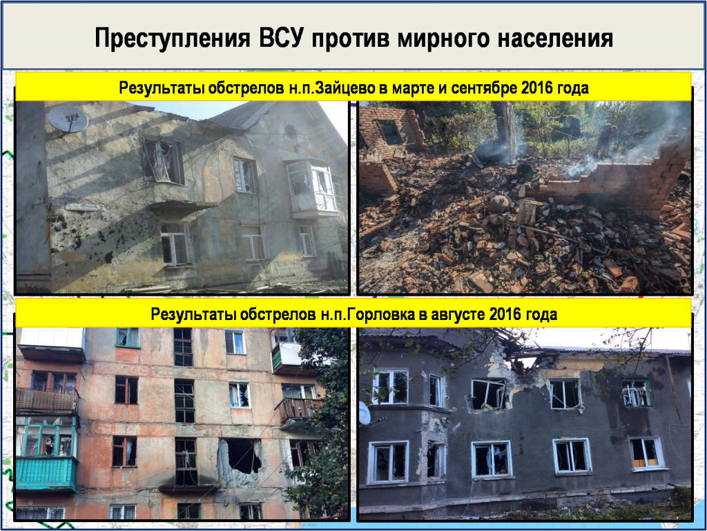Было разрушено и повреждено ВОСЕМЬСОТ ДВАДЦАТЬ домостроений и объектов инфраструктуры Республики. Артиллерийским и минометным обстрелам неоднократно подвергались жизненно важные объекты обеспечения, а также ремонтные бригады, выезжавшие на устранение повреждений. Были зафиксированы факты получения ранений ремонтников. Целеуказание и корректировка огня артиллерии и минометных расчетов осуществлялась с применением беспилотных летательных аппаратов, включая ударные, поставляемых «пособниками терроризма», так называемыми волонтерами.