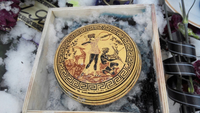 В декабре прошлого года активисты Антифашистского движения Греции передали на могилу командира «Спарты» землю из греческого города Спарта. Сосуд в Донецк доставила профессор института Достоевского Мария Калиба Прифти. Вот он на снимке: