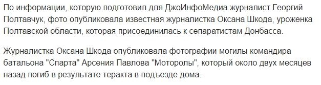 …А 4 января некий киевский сайт «ДжоИнфоМедиа» разразился публикацией «Новости «Новороссии»: появились фото могилы Моторолы - ее хотят сделать главной в «аллее славы». В этом чтиве упоротые писаки, в частности, отметили, что «…по информации, которую подготовил для ДжоИнфоМедиа журналист Георгий Полтавчук, фото опубликовала известная журналистка Оксана Шкода, уроженка Полтавской области, которая присоединилась к сепаратистам Донбасса».