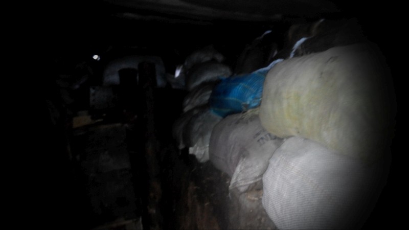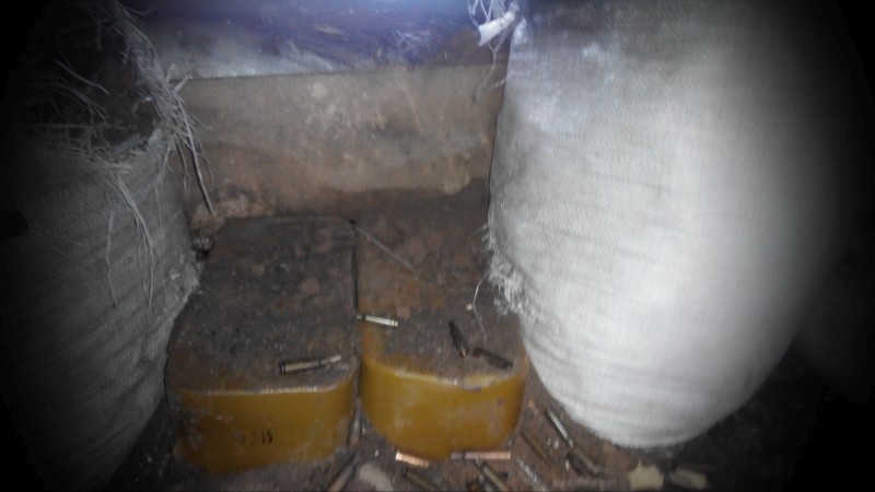 Фотографируя этот «подвальчик», я и не догадывалась, что внутри находится пушистый обитатель. Лишь просмотрев после снимки в ноутбуке, с удивлением обнаружила сверкающие кошачьи глаза. Фронтовой кот ничем не выдал свое присутствие во время нашего пребывания на позиции.