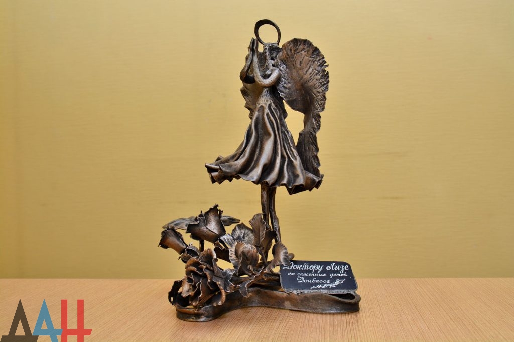 Донецкий кузнец Виктор Михалев выковал из осколков снарядов фигуру молящегося ангела в память об общественном деятеле Елизавете Глинке (известной как Доктор Лиза).