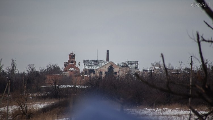 Изрядно сбив дыхание, мы, наконец, достигли окопов Вооруженных сил ДНР, где смогли перевести дух. Подвергая себя немалому риску, Олег забрался на бруствер, откуда смог снять позиции ВСУ: можно было разобрать и развевающийся флаг, и здания, в которых оборудованы огневые позиции. По словам бойцов, расстояние до ближайшей украинской позиции — 250 метров, а до самой дальней — чуть больше километра.