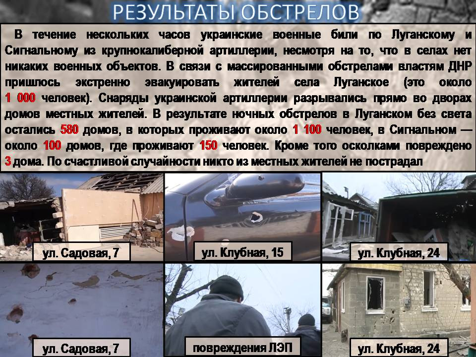 Досье включает данные о командире 92-й отдельной механизированной бригады ВСУ полковнике Викторе Николюке, который в пьяном виде 6 марта приказал обстрелять из тяжелой артиллерии жилые массивы сел Луганское и Сигнальное к юго-западу от Донецка. Тогда около 700 домов в двух селах остались без света, также было повреждено три дома. Установлено, что огонь велся из подконтрольного Киеву села Новомихайловка с использованием РСЗО «Град», 152-мм гаубиц «Гиацинт-Б» и 122-мм САУ «Гвоздика».