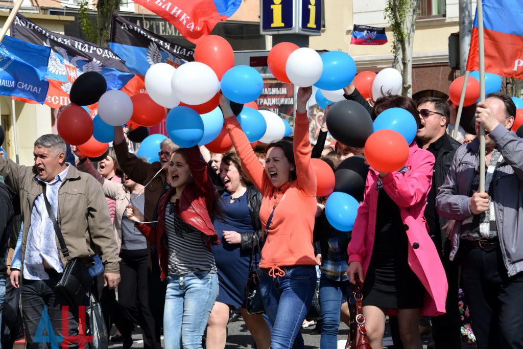 Колонна в составе нескольких тысяч жителей ДНР выдвинулась от главной библиотеки ДНР им. Крупской в направлении площади Ленина, где запланирован первомайский митинг.