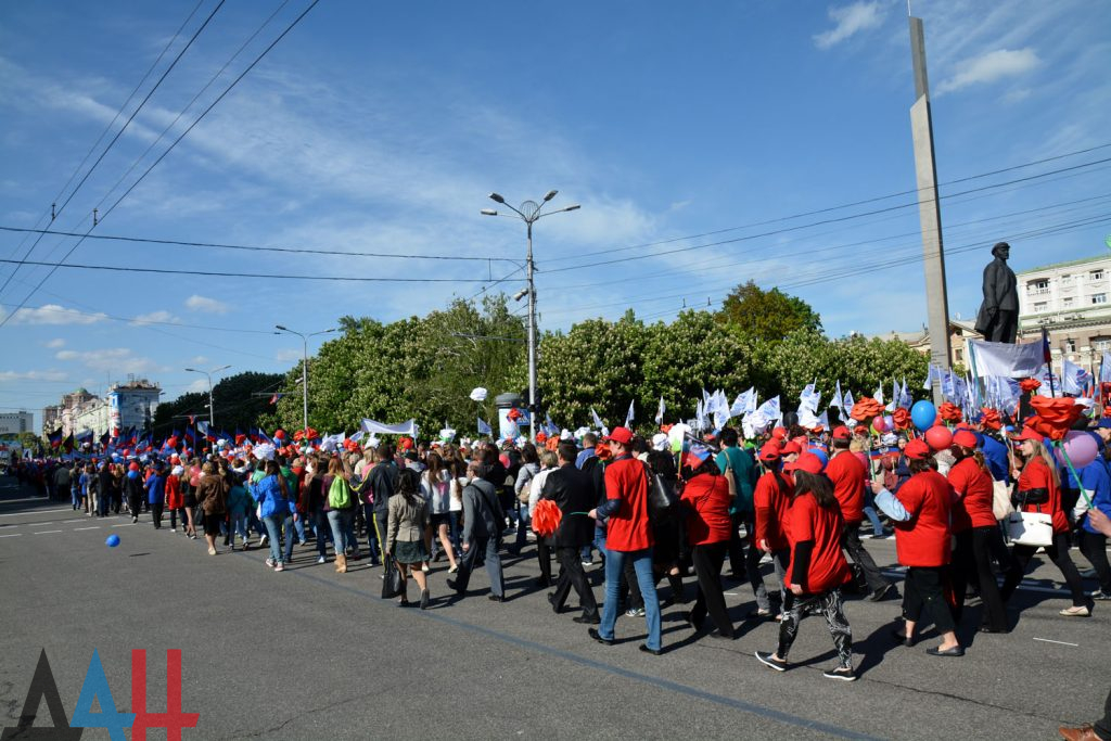 С установленной на площади Ленина трибуны демонстрантов приветствует Глава ДНР Александр Захарченко, председатель Народного Совета Денис Пушилин, специальные гости из России, Абхазии, Южной Осетии и ЛНР.