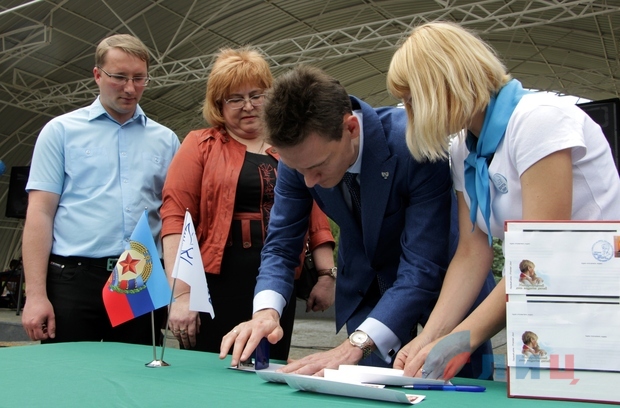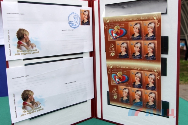 Церемония специального гашения художественной почтовой марки "Спасибо, Доктор Лиза!", выпущенной совместно Луганской и Донецкой Народными Республиками, состоялась сегодня в Луганске в честь празднования Международного дня защиты детей.