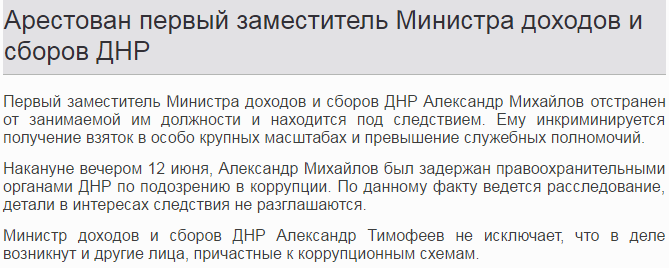 По информации украинской разведки 14 июня 2017 года в Донецке российскими "контролирующими лицами" был заслушан Александр Захарченко, который обвиняется в халатном отношении к выполнению служебных обязанностей, что повлекло за собой масштабное хищение полученных из РФ средств. "Ожидается отставка с последующим арестом ряда должностных лиц в "правительстве ДНР".