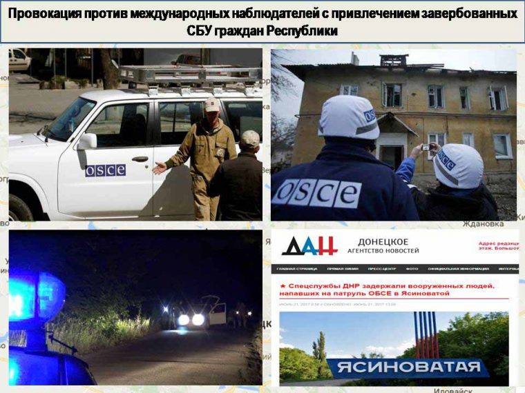 Во время визита заместителя главы ОБСЕ в Украине Александра Хуга в Донецкую Народную Республику и накануне очередной встречи контактных групп по безопасности в Минске украинскими спецслужбами с привлечением завербованных СБУ по программе «Вернись домой» граждан Республики осуществлена циничная провокация против международных наблюдателей. Об этом во время брифинга 23 июня сообщил заместитель начальника управления НМ ДНР, полковник Эдуард Басурин.
