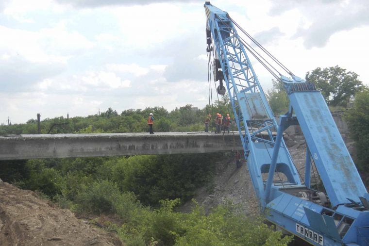 В настоящее время подрядные организации завершили один из наиболее сложных этапов капитального ремонта – демонтаж поврежденных бетонных балок пролетного строения. Работы были осложнены значительной длиной путепровода – она составляет более 33 метров. При этом каждая балка весит более 60 тонн. Для организации эффективной и безопасной работы был привлечен железнодорожный кран восстановительного поезда ГП «Донецкая железная дорога» и два автокрана. На время проведения ремонтных работ на данном участке железной дороги было перекрыто движение поездов.