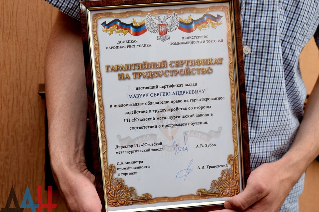 Трое выпускников Донецкого национального технического университета получили сертификаты, гарантирующие трудоустройство на Юзовском металлургическом заводе (ЮМЗ). Торжественное вручение прошло сегодня в задании министерства промышленности и торговли в центре Донецка.