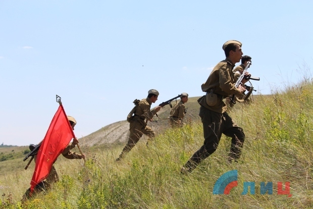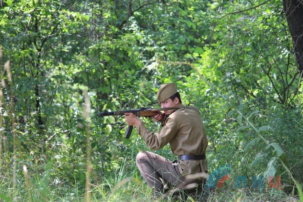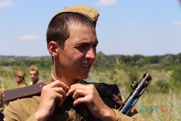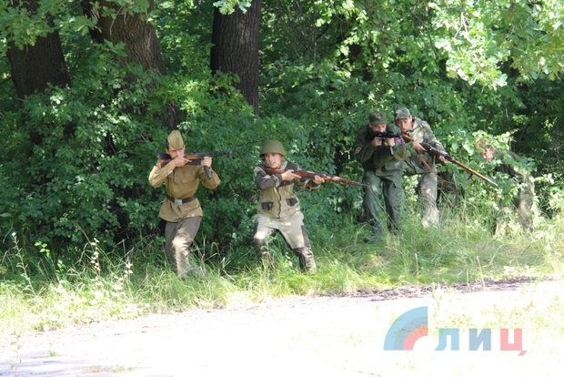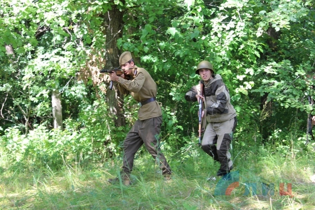 "Это реконструкция боя лета 1943 года, часть бойцов еще в форме 1941 года – не успели части еще переодеться, а часть уже в форме 1943 года с погонами. На самом деле, в этом месте красноармейцы форсировали Донец в феврале 1943 года, но были места, где форсирование было и летом, уже в конце августа выбили немцев с территории Ворошиловградской области, а победное форсирование произошло в августе-сентябре месяце на реке Миус под Саур-Могилой. Тоже, жара вот примерно такая и была, как сейчас (+37 на солнце – примечание ЛИЦ), - рассказал председатель правления ЛВИО Анатолий Феоктистов.