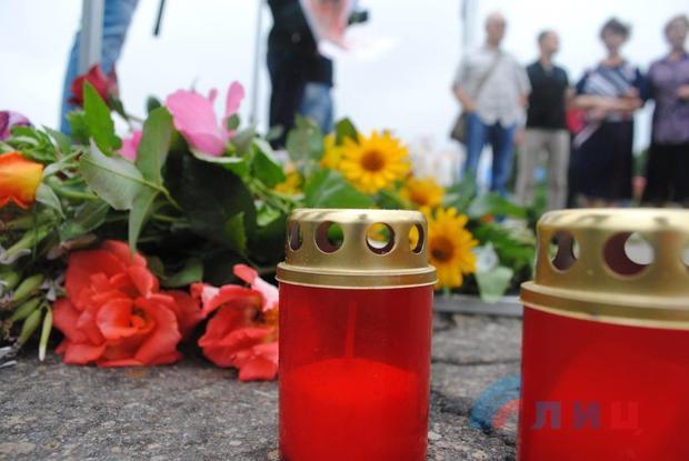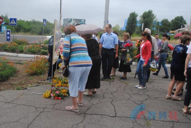 Жители города возложили цветы на месте трагедии, почтили память минутой молчания погибшего во время авиаудара земляка, а также всех краснолучан, погибших в результате вооруженной агрессии украинских карателей.