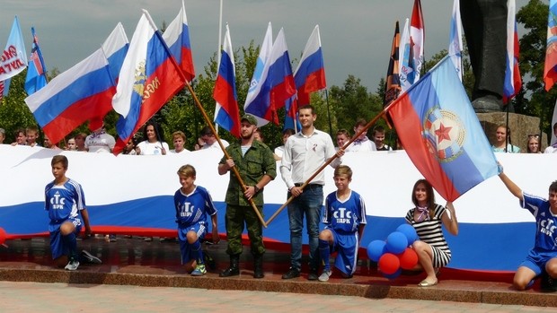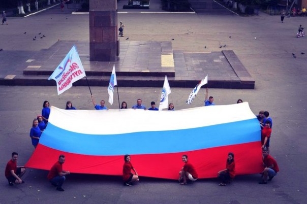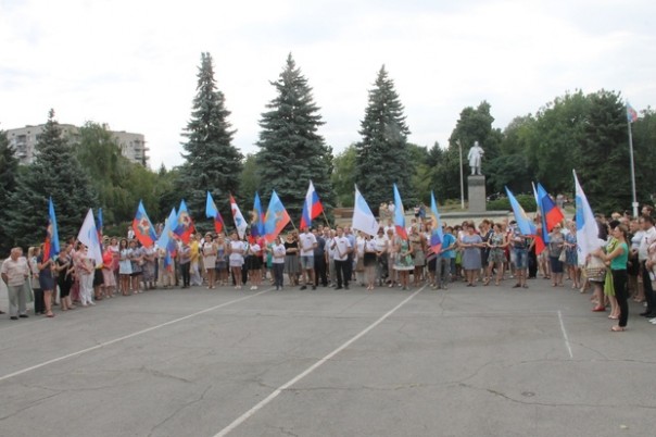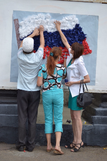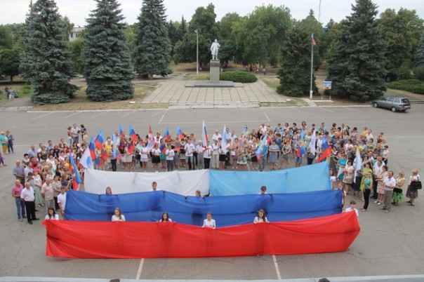 Около двухсот жителей Красного Луча приняли участие в патриотической акции "Флаг Державы – символ славы!". Лидеры молодежных общественных организаций, активисты ОД "Мир Луганщине", сотрудники горадминистрации и госучреждений города Луча сделали своими руками из бумаги цветы, которые затем расположили на стенде в виде российского триколора.