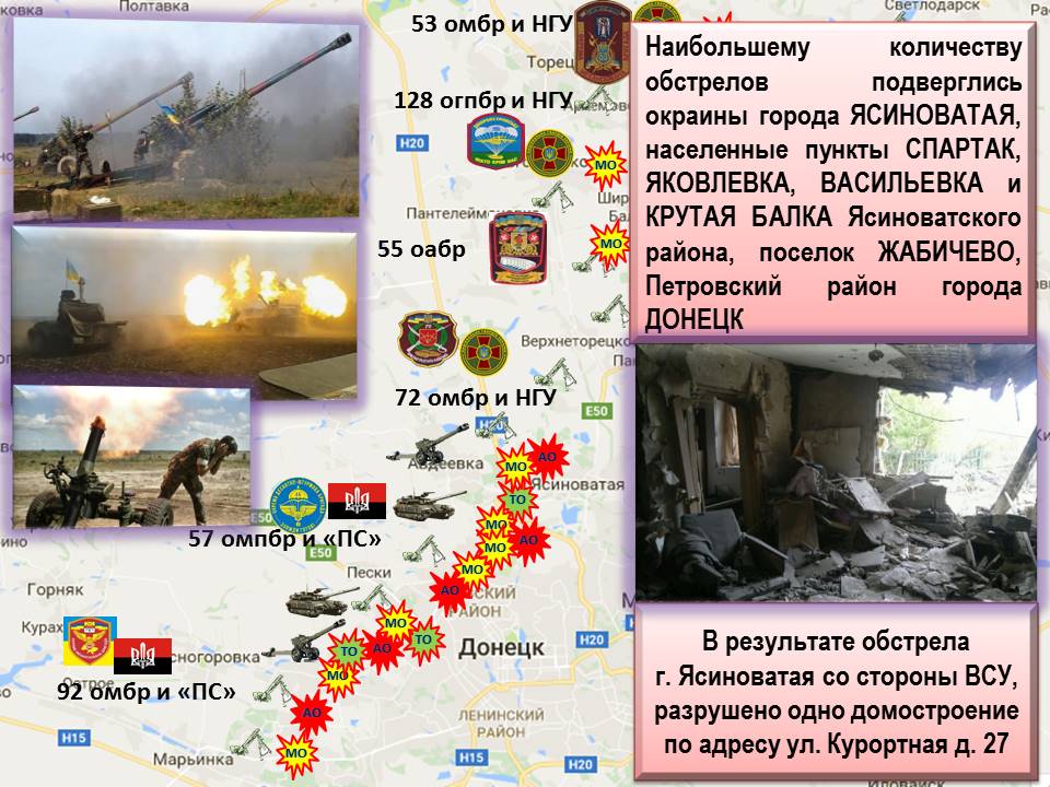 Отмечается, что при обстрелах ДНР подразделения противника использовали минометы, вооружение БМП и БТР, а также стрелковое оружие. Так, по прифронтовым зонам на донецком направлении с позиций ВСУ выпущено 14 мин калибра 82 мм. На мариупольском и горловском направлениях зафиксированы обстрелы двух населенных пунктов из бронетехники и стрелкового оружия.