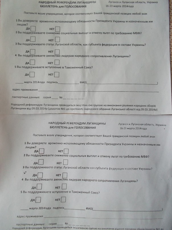 Поэтому в середине марта Луганск решил провести плебисцит. Я сам распространял в Перевальском районе опросные листы, которые потом хотели передать в Киев. Вот как он выглядел: