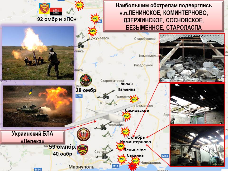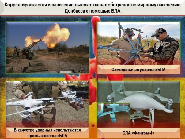 «Для корректировки артиллерийского огня украинские силовики используют беспилотные летательные аппараты, также всё чаще отмечаются случаи установки в кустарных условиях на их несущую часть различных боеприпасов. На минувшей неделе военнослужащими ВС ДНР из стрелкового оружия было сбито два таких беспилотника «Лелека» и «Фантом-4»», — сказал замком.
