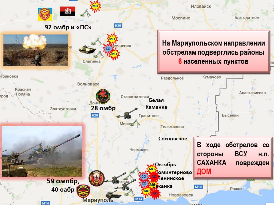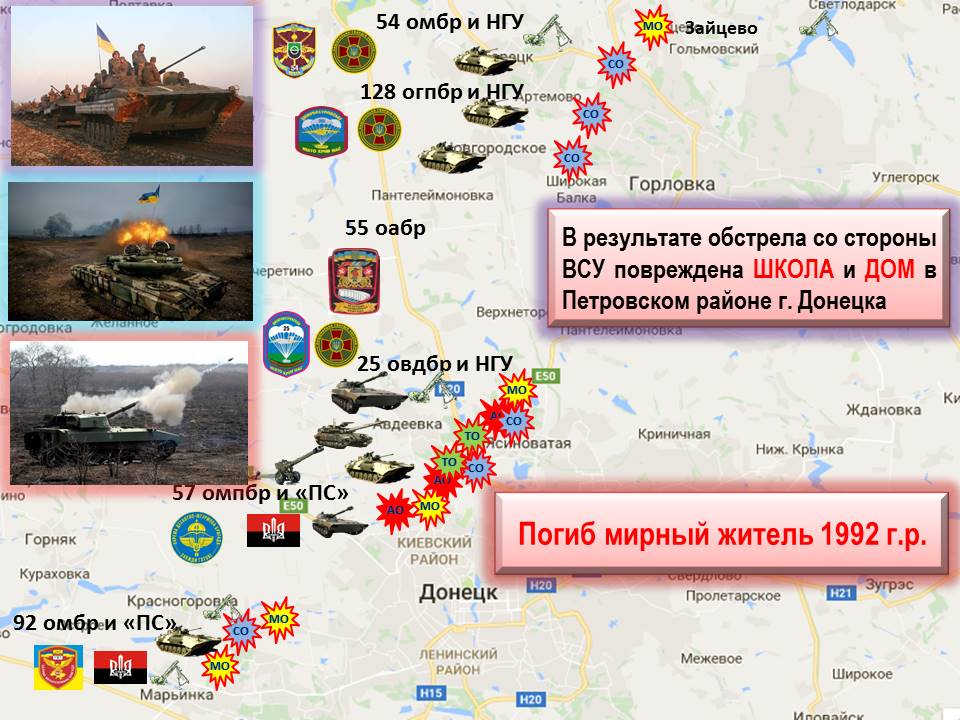 «На Донецком направлении противник применил артиллерию, минометы, танки, вооружение БМП, различные виды гранатометов и стрелкового оружия. По прилегающим районам тринадцати населенных пунктов выпущено пять артиллерийских снарядов калибра 122 мм, два танковых снаряда, двести восемь мин калибра 120 и 82 мм.