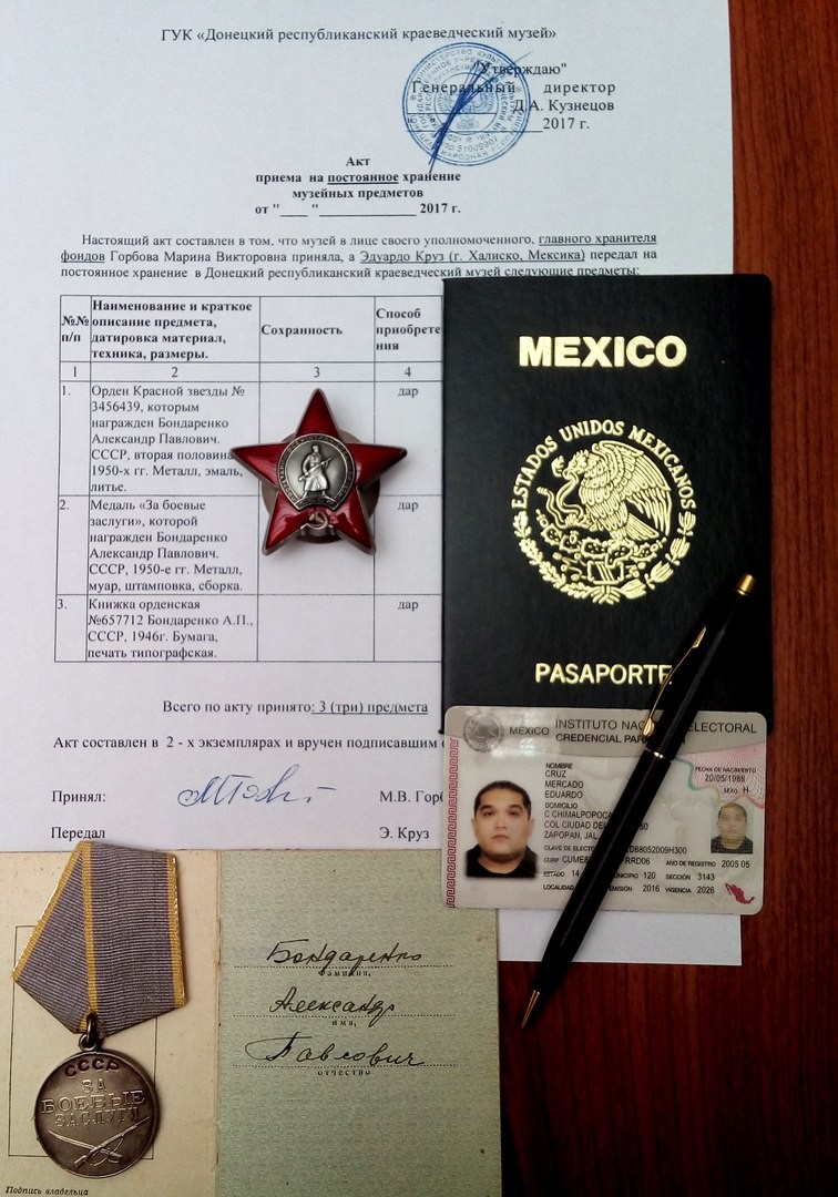 Выкупив на одном из аукционов награды Александра Бондаренко, он обратился в консульство России в Мексике. После соблюдения всех необходимых формальностей награды ветерана в конце концов прибыли в Москву, а оттуда были переданы в Донецк.