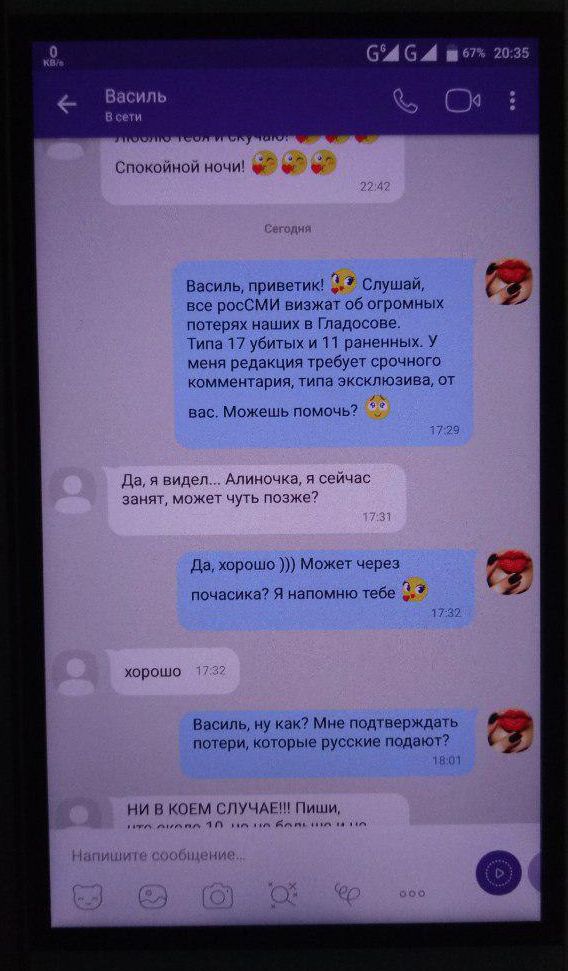 Сегодня от своего друга из Киева получил очень интересную информацию, которая подтверждает большие потери ВСУ под Горловкой. Этому человеку доверяю. Это вчерашняя переписка одной из журналисток информагентства «РБК-Украина» с офицером пресс-центра штаба «АТО» Василием Лабаем, в ходе которой обсуждается выпуск материала для опровержения заявления Эдуарда Александровича Басурина о больших потерях ВСУ в Гладосово и Металлисте. Ценность ее в том, что Лабай признает большие потери. Выводы делайте сами. Источник