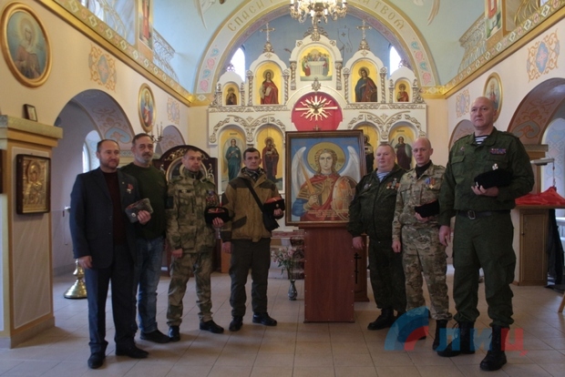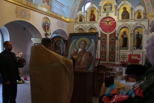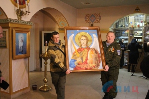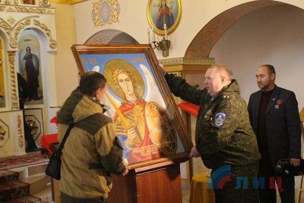 "В ноябре в Москве на IV Казачьем Круге СКВРиЗ было принято решение в дар казакам Луганска передать икону Архангела Михаила, чтобы по молитвам командующего небесным воинством молодая Луганская Народная Республика одержала победу над врагами, которые пришли на ее землю. Думаю, при его поддержке враг будет сражен как на земле, так и на небе. Икона была написана в Москве и освящена сегодня здесь, в храме Луганской Народной Республики", - рассказал он.