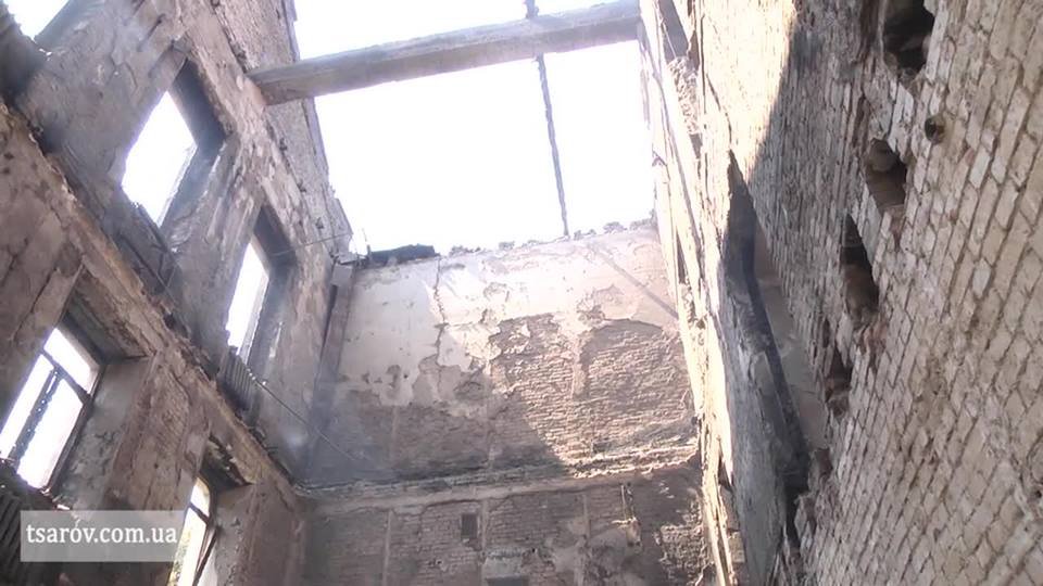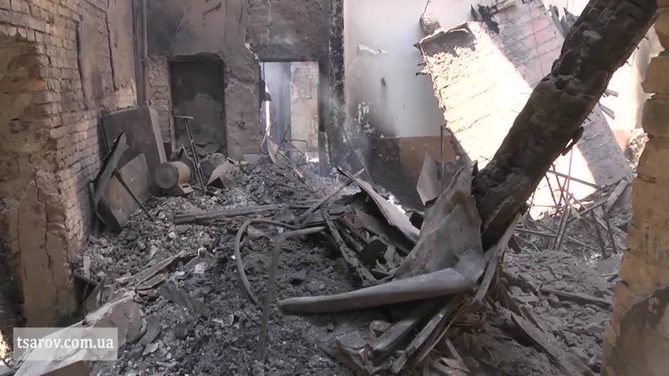 Сотрудники школы просто плачут. Школьный сторож Александр Яковлевич вспоминает, что обстрел школы начался 3 августа где-то в 11.30 . Сначала снаряд упал рядом - очевидно, пристреливались. А второй попал прямо в спортзал. Спортзал сложился вместе с крышей, начался пожар, который тлеет до сих пор.
