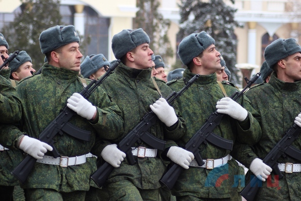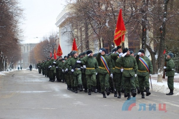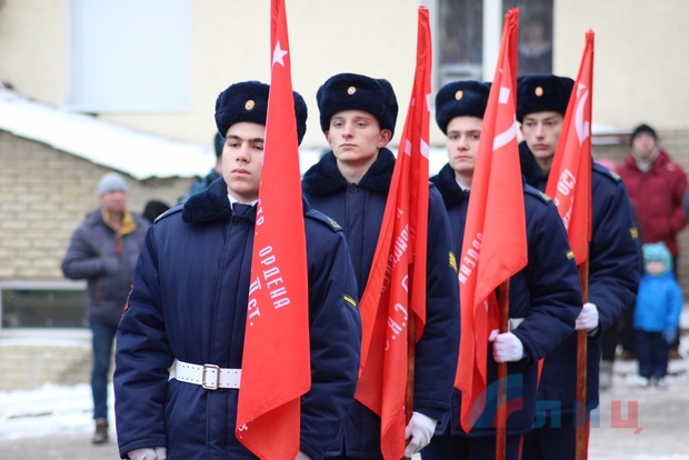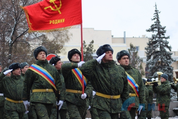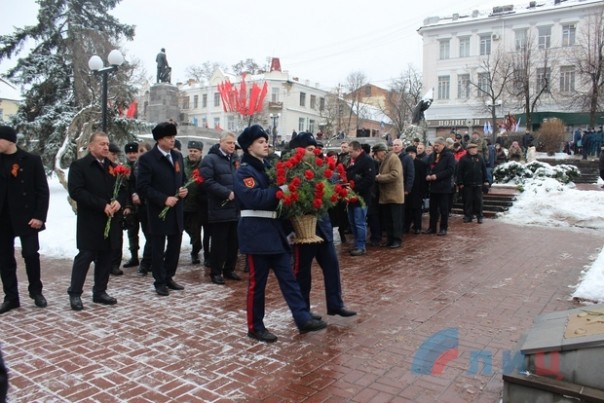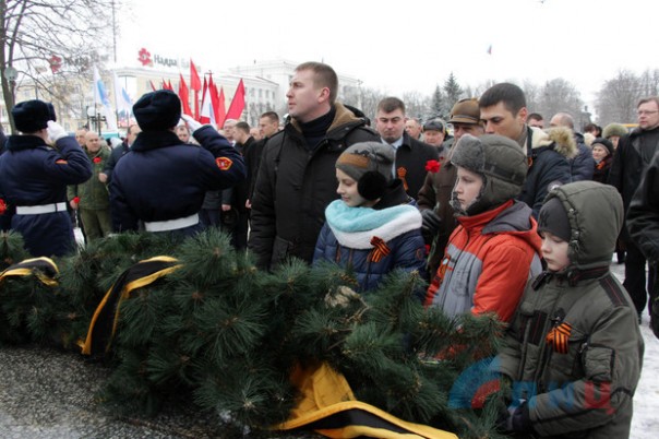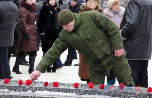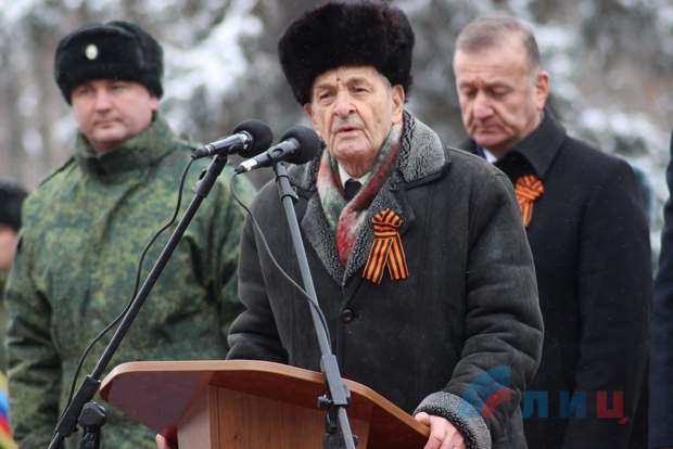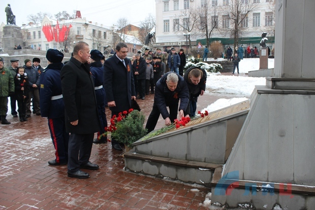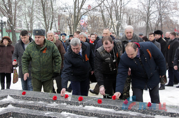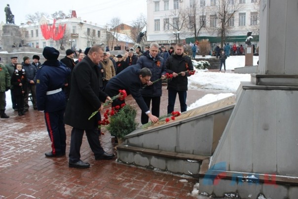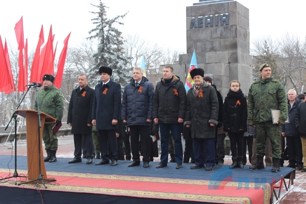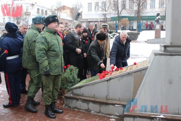 Офицер Народной милиции, руководитель ансамбля "Новороссия" Роман Разум зачитал поздравительный адрес от Луганского землячества в Москве в честь памятной даты. Участники митинга почтили минутой молчания память героев, павших в боях за освобождение Луганска и возложили цветы к Братской могиле офицеров Советской Армии. В рамках митинга также состоялся парад военнослужащих Народной милиции ЛНР.