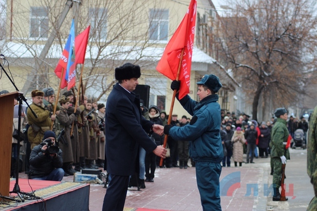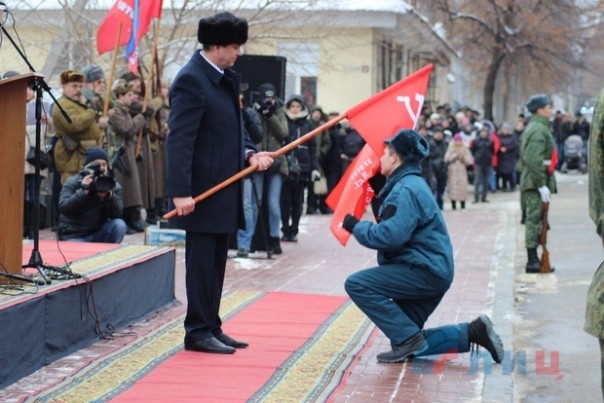 Знаменная группа внесла на площадь боевые знамена 18-го стрелкового корпуса, 279-й, 243-й, 59-й стрелковых дивизий и 267-й штурмовой авиационной дивизии, принимавших участие в освобождении Луганска в 1943 году.
